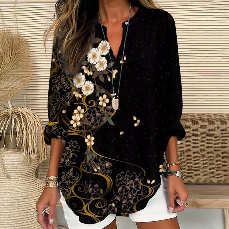 Janpanese Vintage Cherry Blossoms Pattern Print V Neck Long Sleeve Blouse