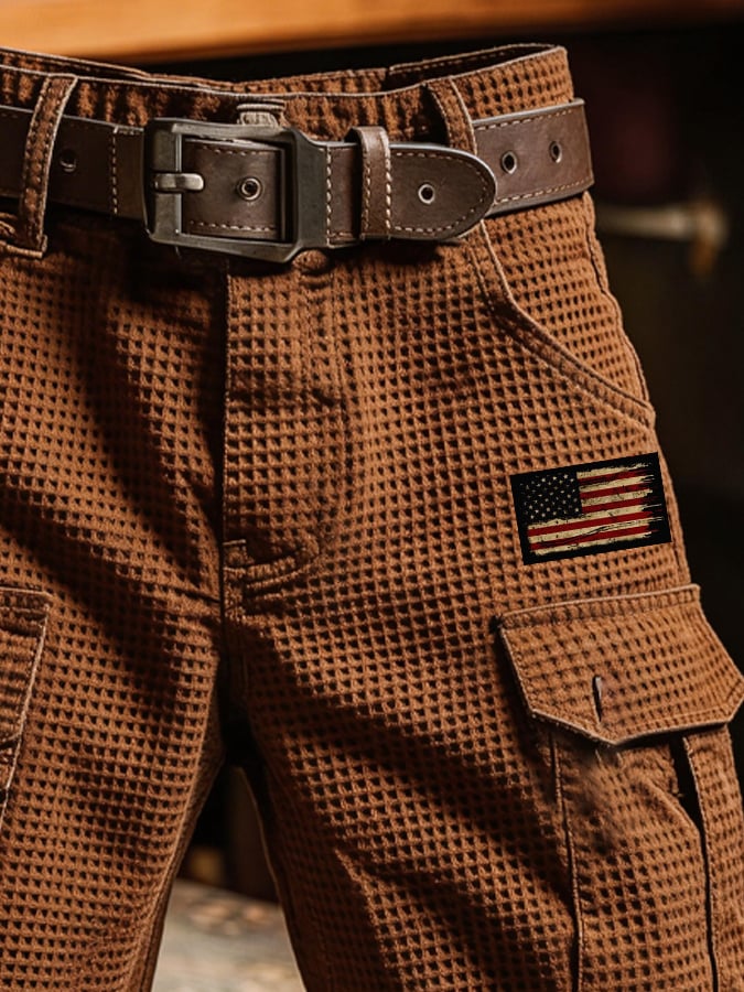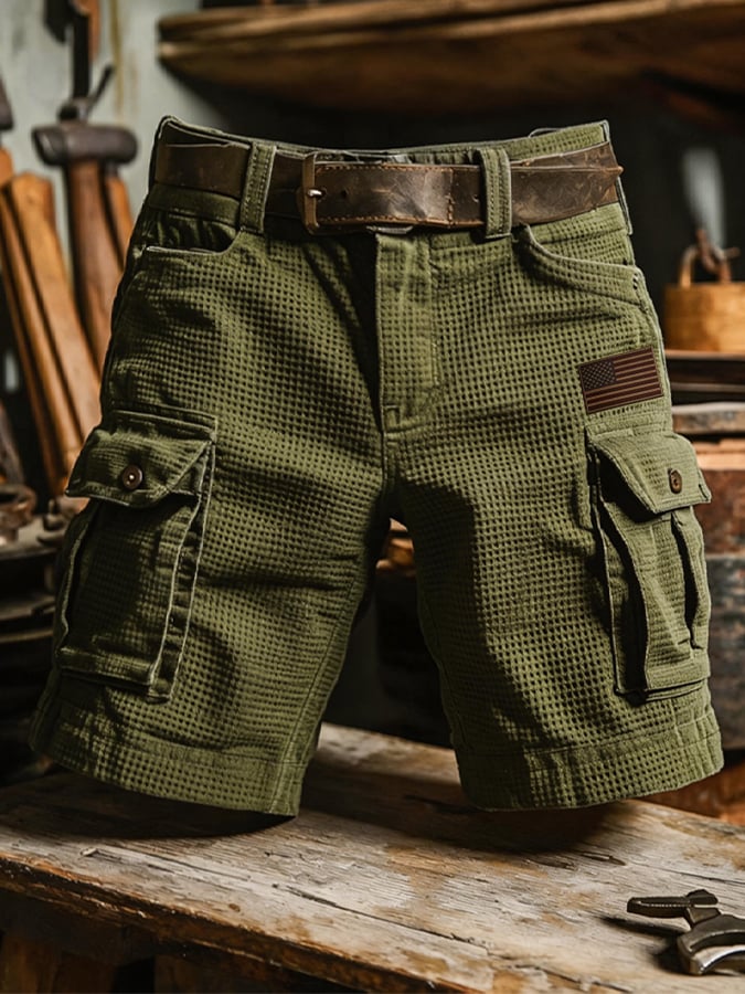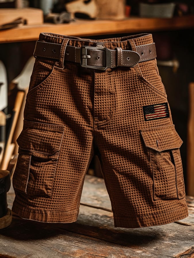 Men's Retro Outdoor Washed & Distressed Multi-Pocket Functional Waffle-Knit Cargo Shorts$49.99 USD$79.98 USD