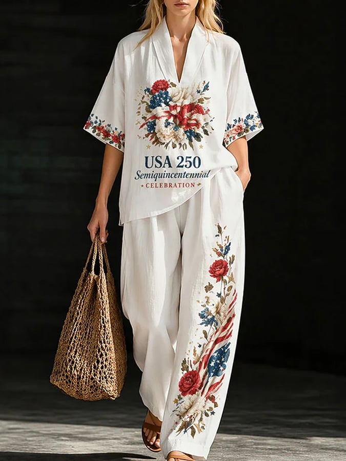 Women's Casual American 250th Anniversary Cotton Linen Two-Piece Set: V-neck Top + Wide-Leg Pants