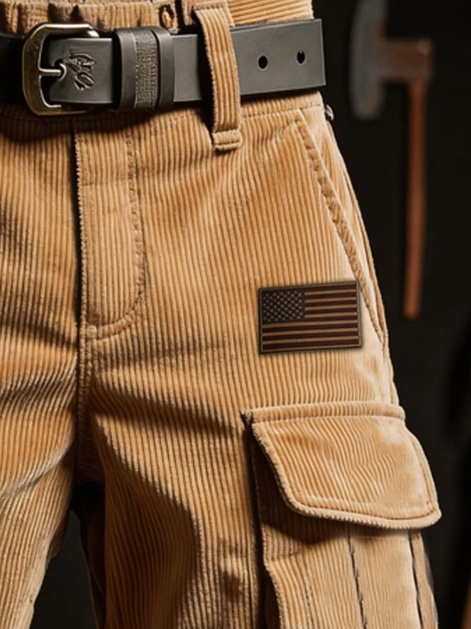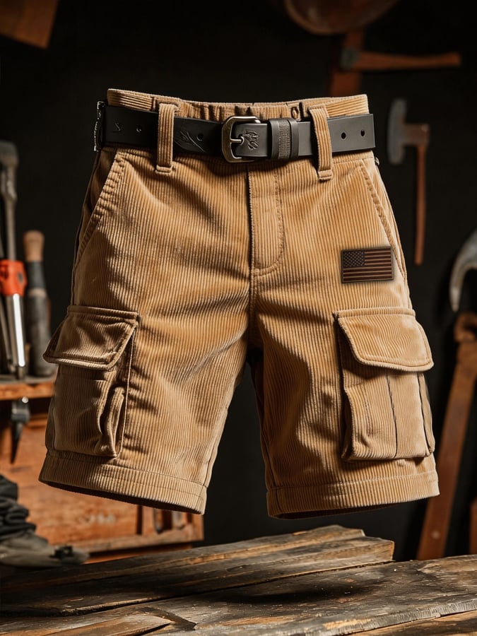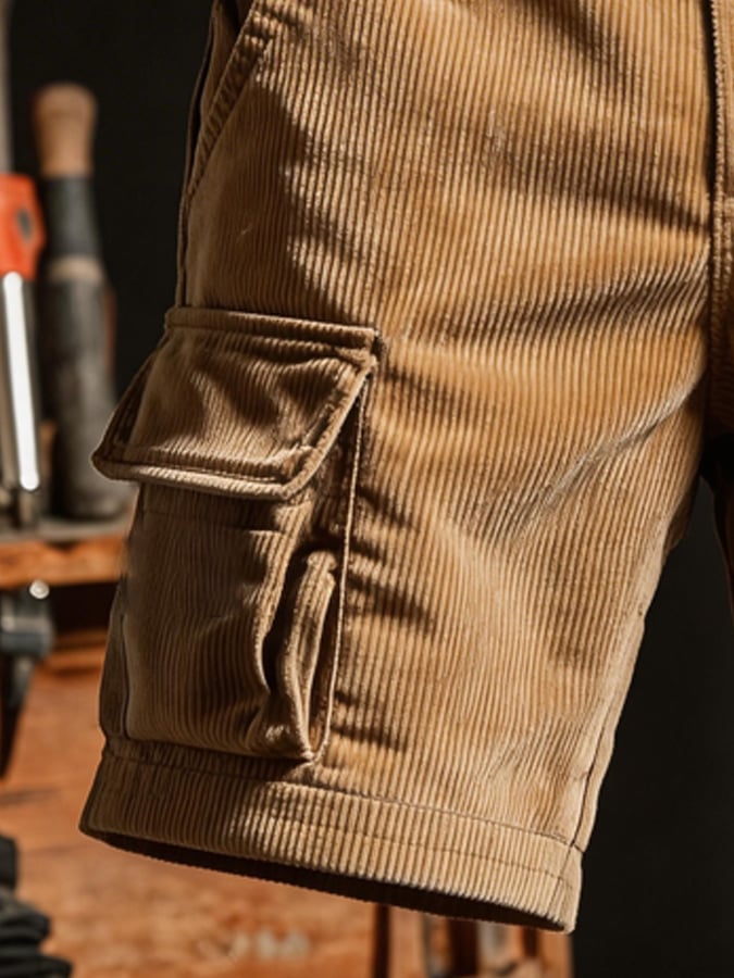 Men's Retro Outdoor Washed & Distressed Multi-Pocket Functional Corduroy Cargo Shorts