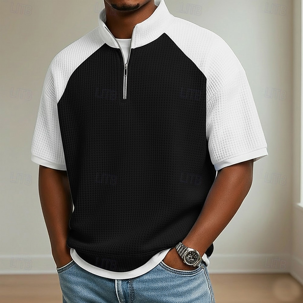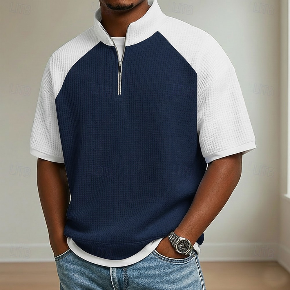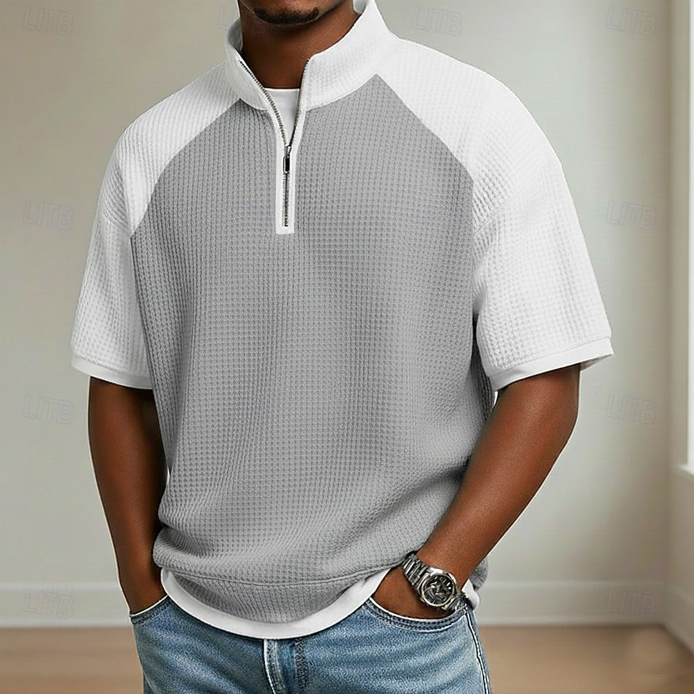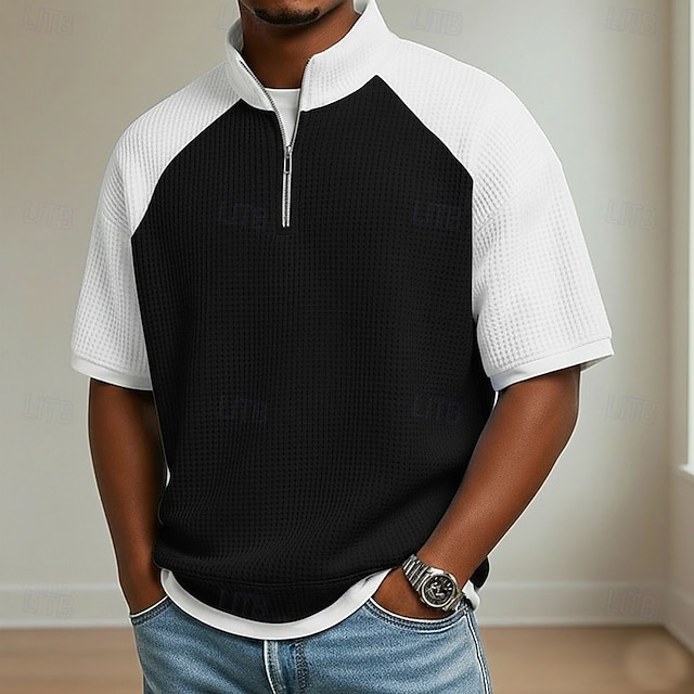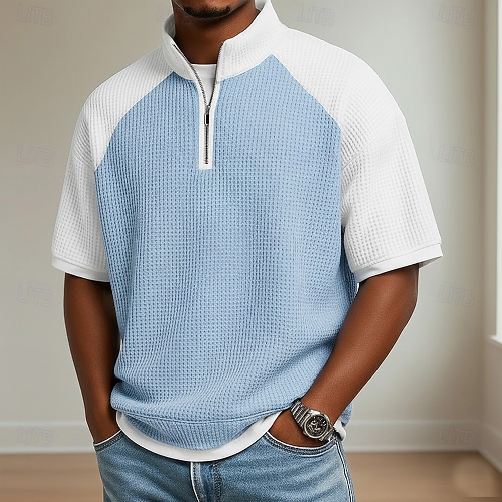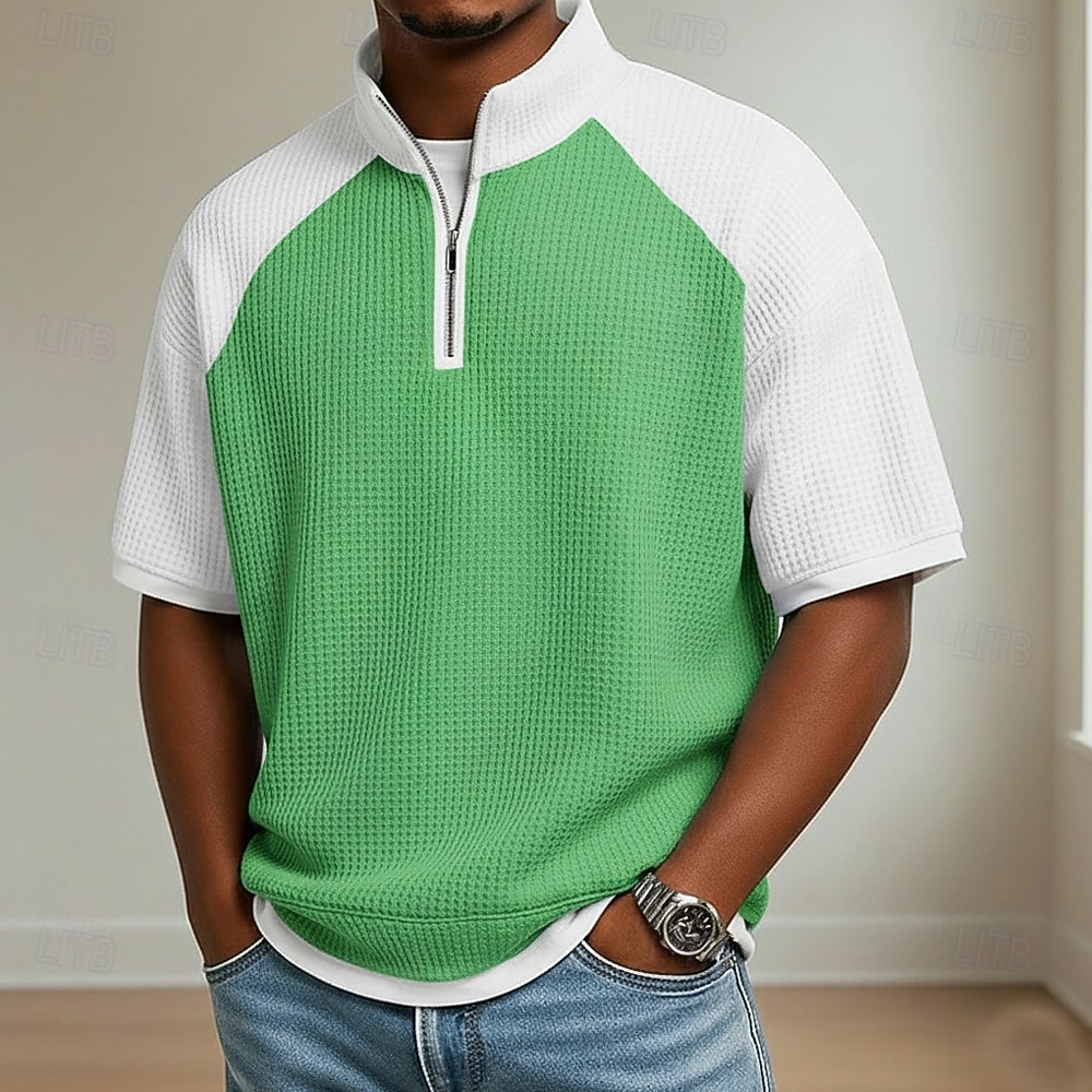Fabric:Waffle Fabric,Tops Type:Waffle Polo Shirts,Gender:Men's,Design:Color Block,Buttons,Occasion:Casual,Holiday,Style:Comfortable,Modern,Basic,Fit Type:Relaxed Fit,Neckline:Standing Collar,Sleeve Length:Short Sleeve,Elasticity:Micro-elastic,Look After Me:Wet and Dry Cleaning,Washable,Machine wash,Pattern:Plaid,Color Block,Season:Summer,Spring,