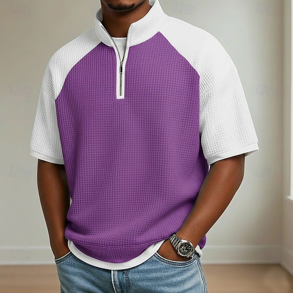 Men's Waffle Polo Shirts Casual Holiday Standing Collar Short Sleeve Basic Modern Plaid Color Block Color Block Buttons Summer Spring Relaxed Fit Blue Black Navy Blue Purple Green Gray Waffle Polo