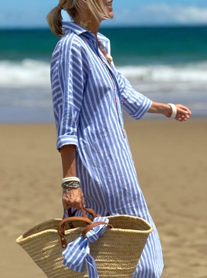 Elevate your summer wardrobe with a classic striped summer shirt dress. Crafted from premium, lightweight vegan linen, this dress ensures you stay cool and comfortable even on the hottest days.