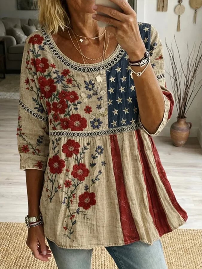 Women'S Casual Retro Cotton-Linen Top With Cutout Details And Usa 250th Anniversary Print